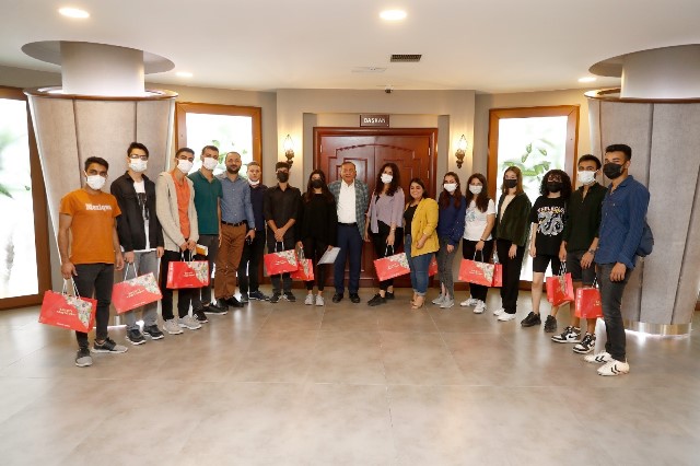 Başkan Akay’ı makamında ziyaret eden eğitim yardımından yararlanan bir grup öğrenci, Akay’a desteğinden dolayı teşekkür etti.
