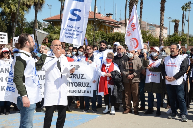 Adana Kasım Gülek Köprüsü üzerinde toplanan Adana Sağlık Platformu üyeleri Uğur Mumcu Meydanına kadar birlikte yürüdü. Adana Sağlık Platformu adına Adana Tabip Odası Başkanı Uzm. Dr. Selahattin Menteş burada basın açıklaması yaparak taleplerinin yerine gelmesini yineledi.