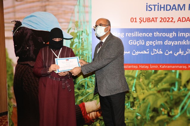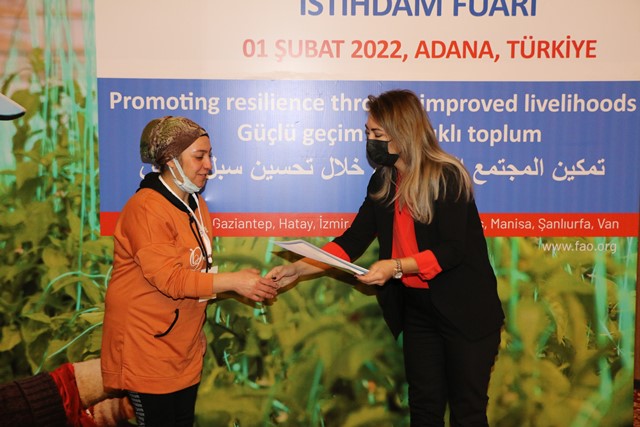 Türkiye genelinde aralarında Adana’nın da bulunduğu 10 ilde Tarım ve Orman Bakanlığı ile Çalışma ve Sosyal Güvenlik Bakanlığı desteğinde Birleşmiş Milletler Gıda ve Tarım Örgütü (FAO) tarafından “Güçlü geçim dayanıklı toplum” sloganıyla Avrupa Birliği tarafından finanse edilerek yürütülen proje ile mesleki yeterlilik kazanan Suriyeli ve Türk 299 kursiyere sertifika verildi.